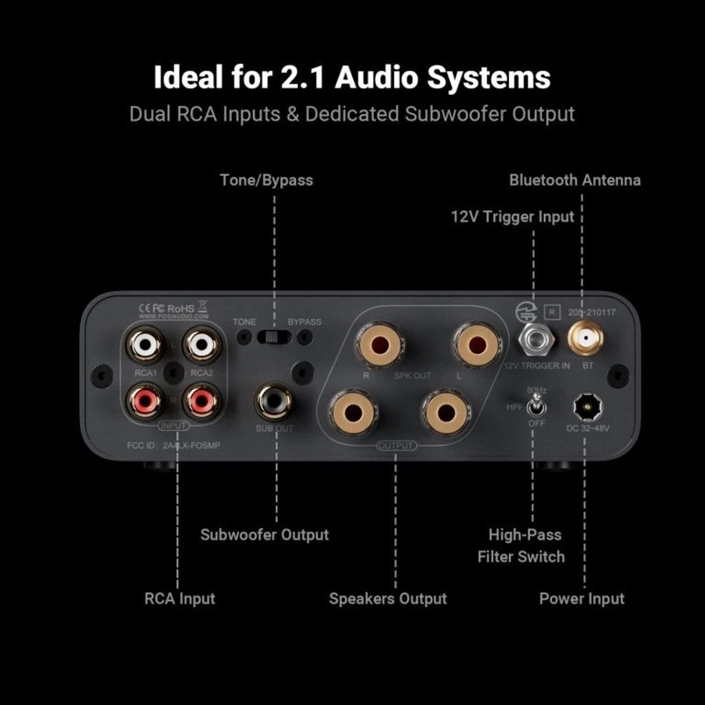 Vďaka dedikovanému subwooferovému výstupu ľahko vytvoríte 2.1 systém. Prepínanie medzi analógovým a bezdrôtovým zdrojom je okamžité pomocou samostatného tlačidla.
