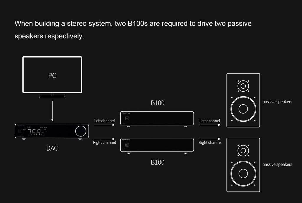 Výkonový monoblokový zosilňovač pre reproduktory s impedanciou 4/8 ohmov. Výkon až 100 W pri dynamickom rozsahu 151 dB.