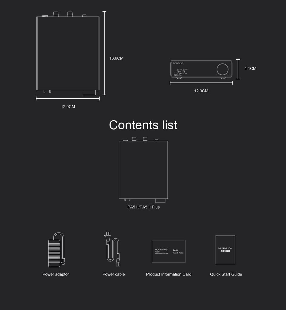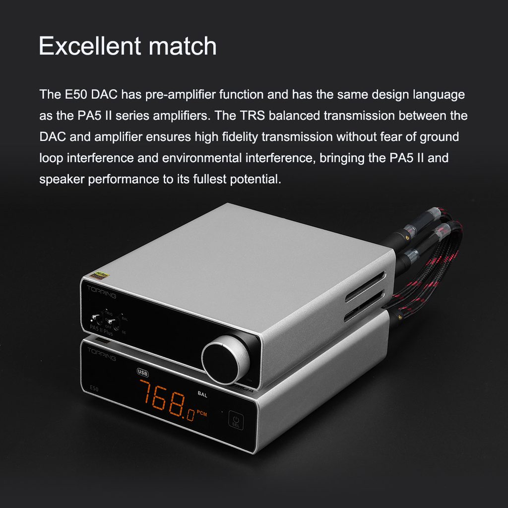 Výkonná verzia stolového reproduktorového zosilňovača Topping. Až 100 W na kanál, trieda D, frekvenčný rozsah 20 - 40 000 Hz, plne symetrické obvody, dva prepínateľné vstupy Jack 6,3 mm a symetrický TRS 6,3 mm.