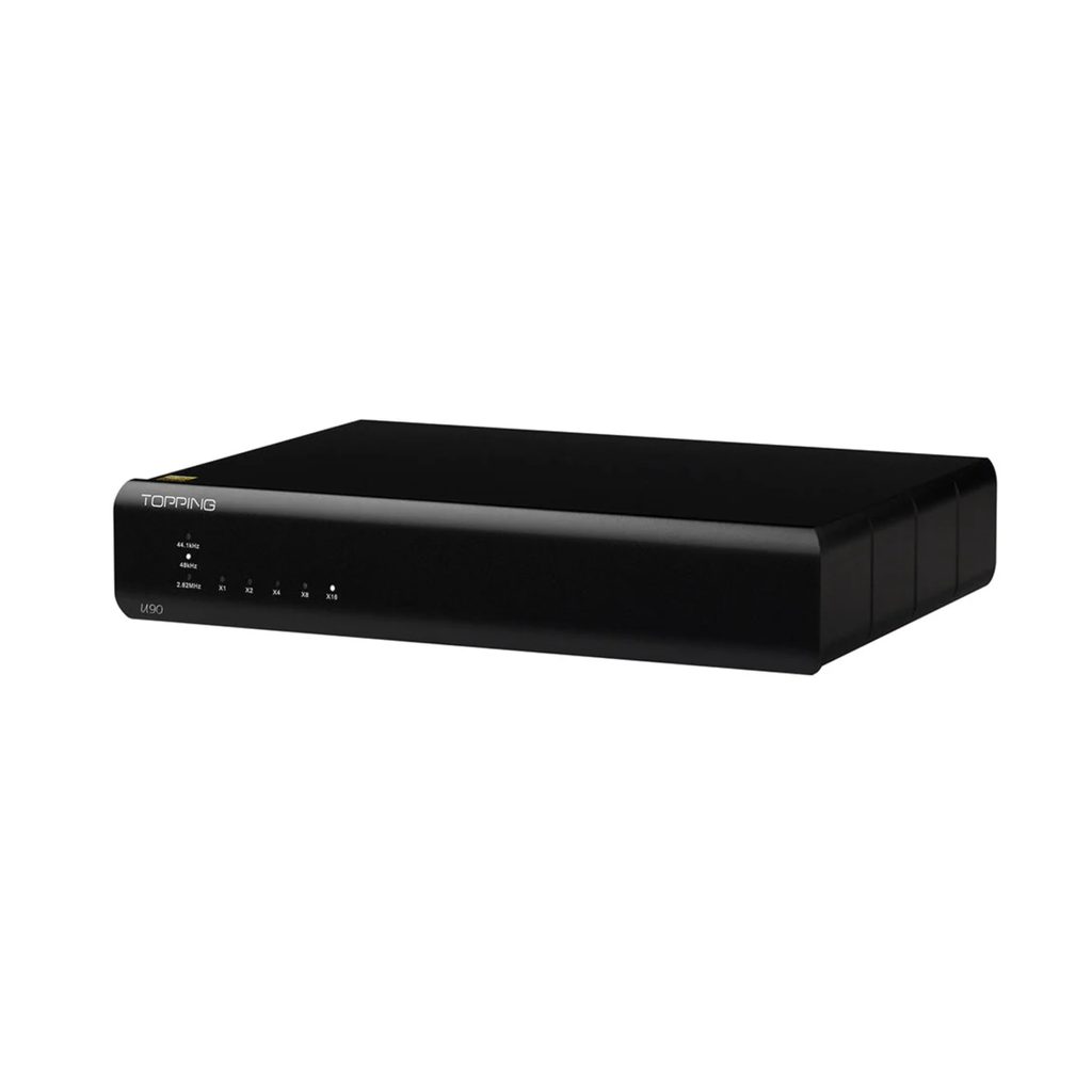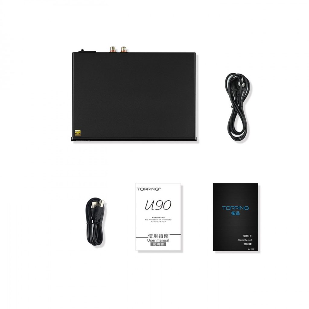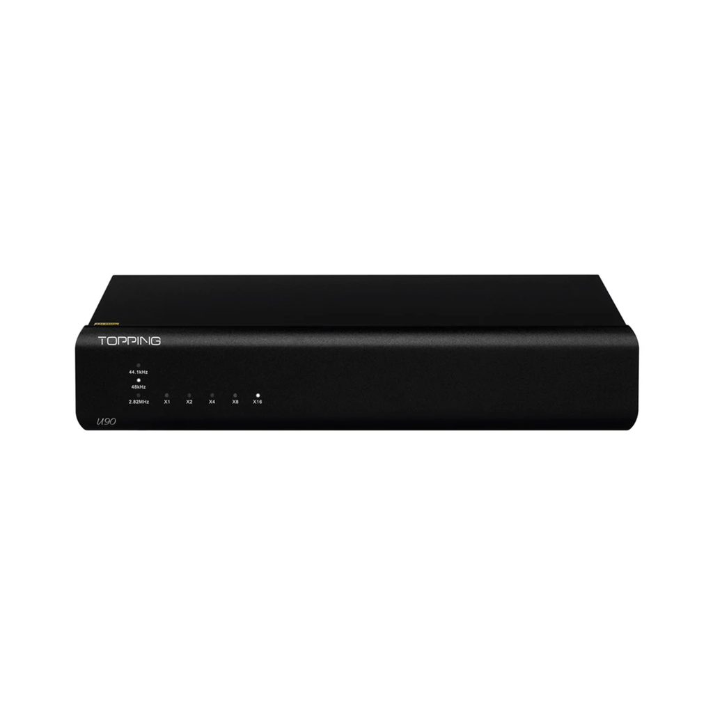 Topping U90 je rozhranie USB na prenos digitálneho signálu z počítača alebo iného zdroja USB do iných digitálnych zariadení (napr. DAC), vysoké rozlíšenie, široký rozsah výstupov. Vstup: USB-B; výstupy: I2S LVDS, koaxiálny, AES/EBU (XLR) a optický toslink. 12V spúšť, podporované rozlíšenie pre I2S: PCM 32bit 768 kHz, natívne DSD512, podporované rozlíšenie pre AES (XLR), optický alebo koaxiálny výstup: PCM 24bit 192 kHz, DSD64.