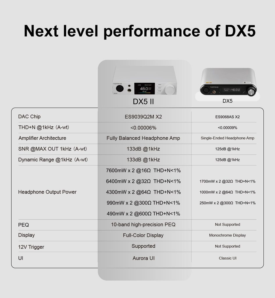 Topping DX5 II nadväzuje na svojho úspešného predchodcu a posúva hranice výkonu a kvality zvuku v kategórii slúchadlových zosilňovačov a D/A prevodníkov. Inovácie sa dotkli každej časti zariadenia, od digitálno-analógovej konverzie až po zosilňovacie obvody, a výsledkom je zariadenie, ktoré uspokojí aj tých najnáročnejších audiofilov.