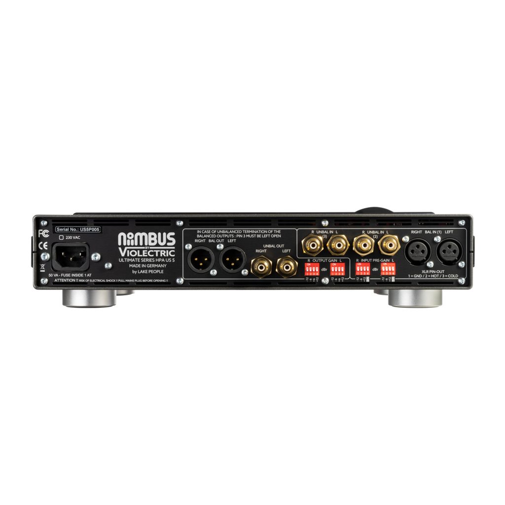 Niimbus US 5 PRO je vybavený rôznymi typmi výstupov, vrátane 1× nesymetrického linkového výstupu (RCA) a 1× symetrického linkového výstupu (XLR), čím zabezpečuje širokú kompatibilitu s rôznymi audio systémami a slúchadlami. Vstupy sú realizované cez konektory XLR a RCA Cinch.