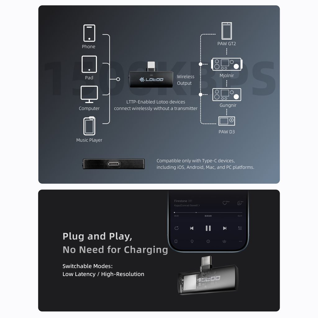 Vysielač nevyžaduje nabíjanie - napájanie získava priamo z pripojeného zariadenia. Je kompatibilný s širokou škálou operačných systémov, vrátane iOS, Android, Windows a macOS, rovnako ako s Lotoo DAP (napr. MJÖLNIR, GT2 a budúce produkty).