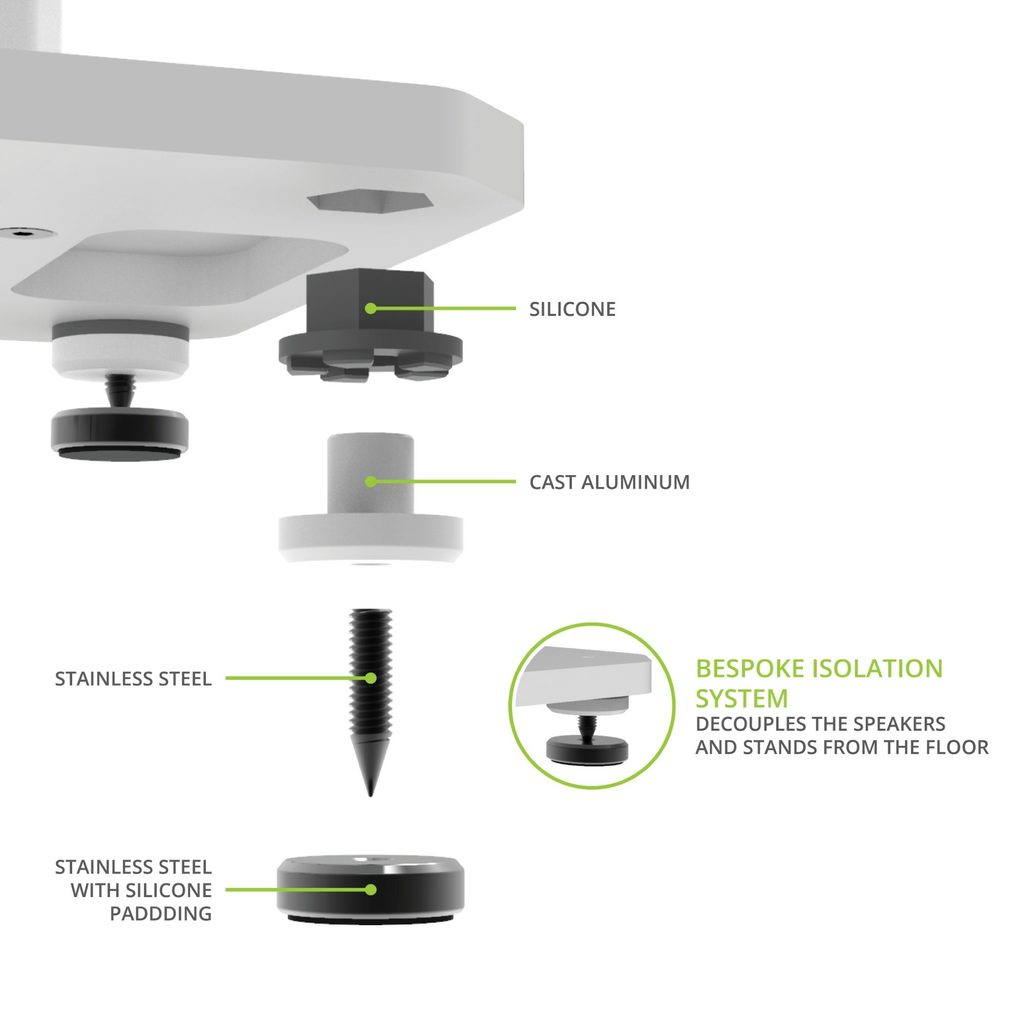 Súčasťou sú tvrdé podložky so silikónovými vankúšikmi na ochranu drevených podláh. Voliteľné samolepiace penové podložky na hornej doske ďalej zlepšujú tlmenie a optimalizujú pripojenie k reproduktoru.