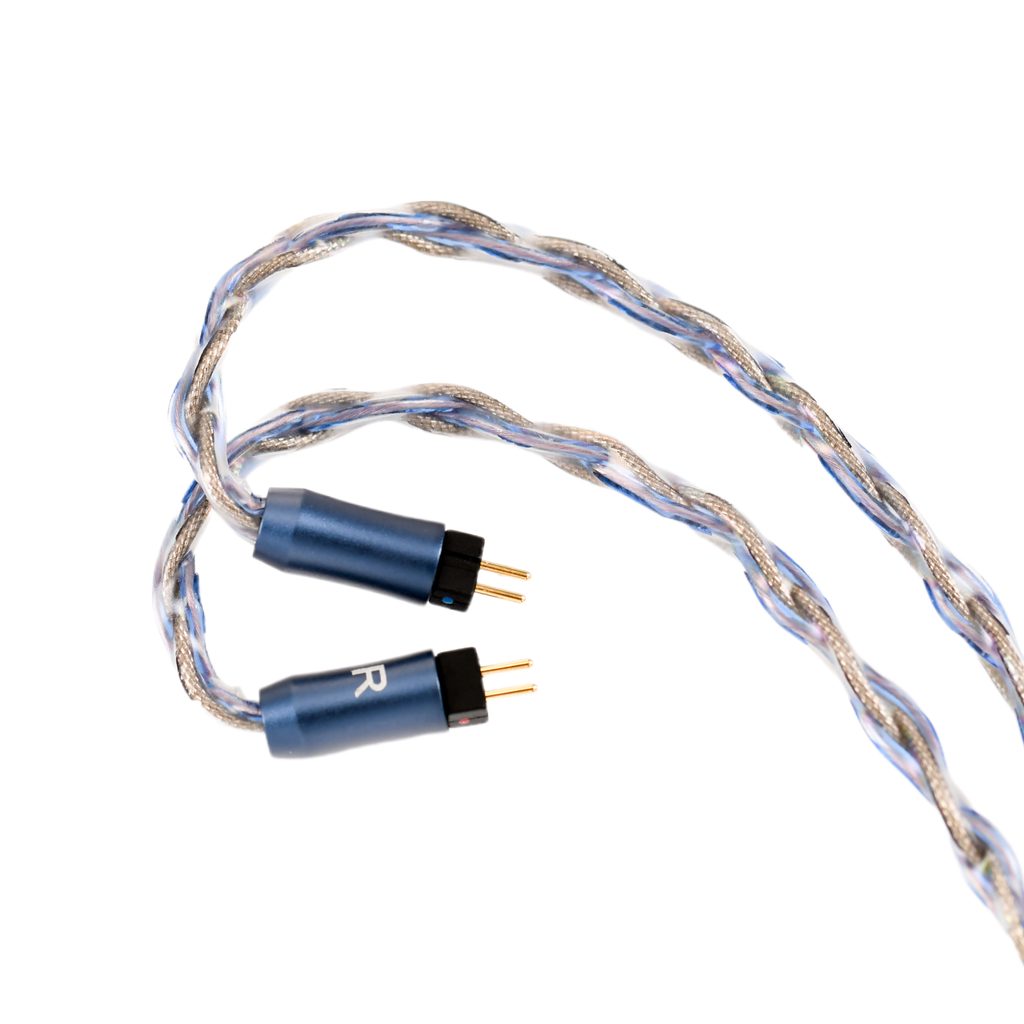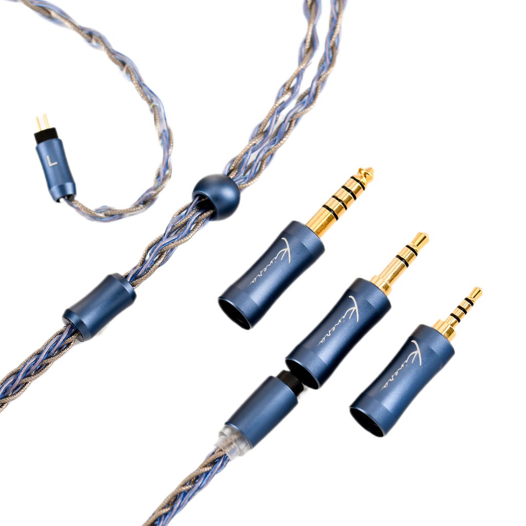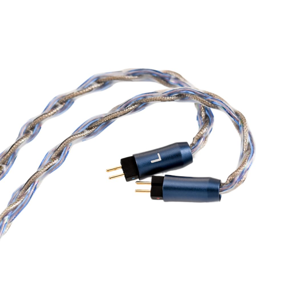 Vylepšený modulárny strieborný opletený kábel, dĺžka 122 cm ± 2 cm, vymeniteľné redukcie 2,5 mm, 3,5 mm a 4,4 mm. Pripojenie k 2-kolíkovému konektoru slúchadiel.