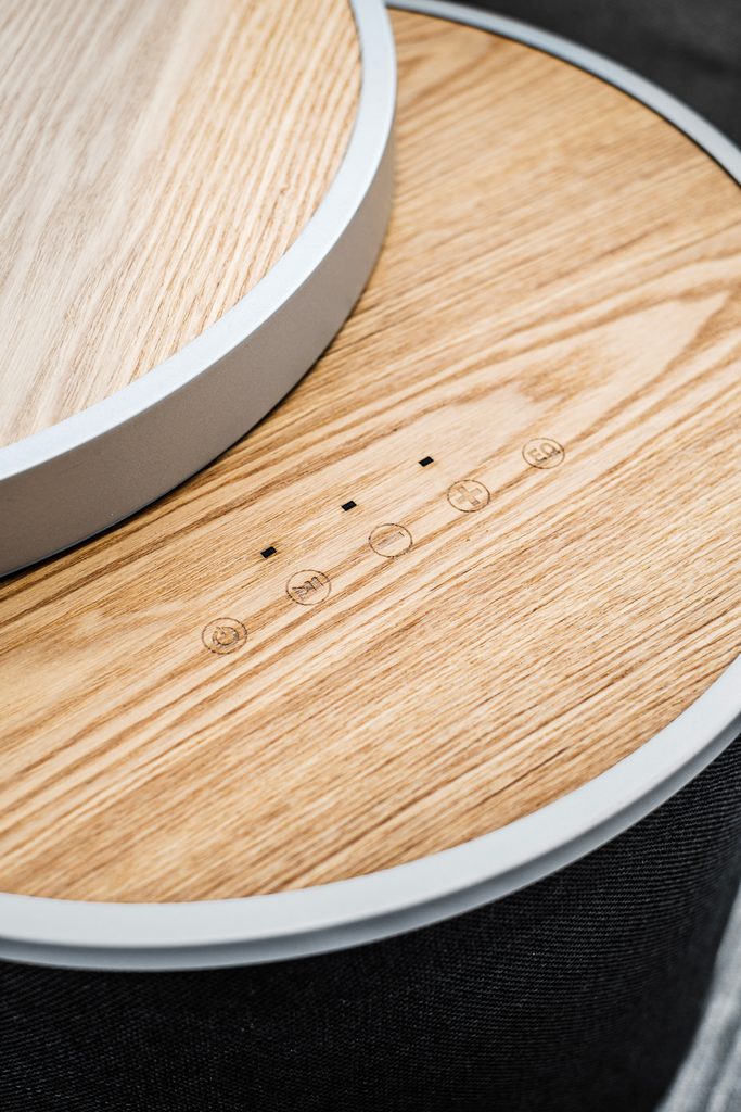 Reproduktor VIBE môžete použiť aj na nabíjanie telefónov. Slúži na to bezdrôtové nabíjanie v hornej doske reproduktora aj výstup USB na zadnej strane reproduktora. Okrem nabíjacej špirály nájdete na hornej doske aj dotykové tlačidlá na nastavenie hlasitosti, ovládanie prehrávania alebo výber režimu ekvalizéra.