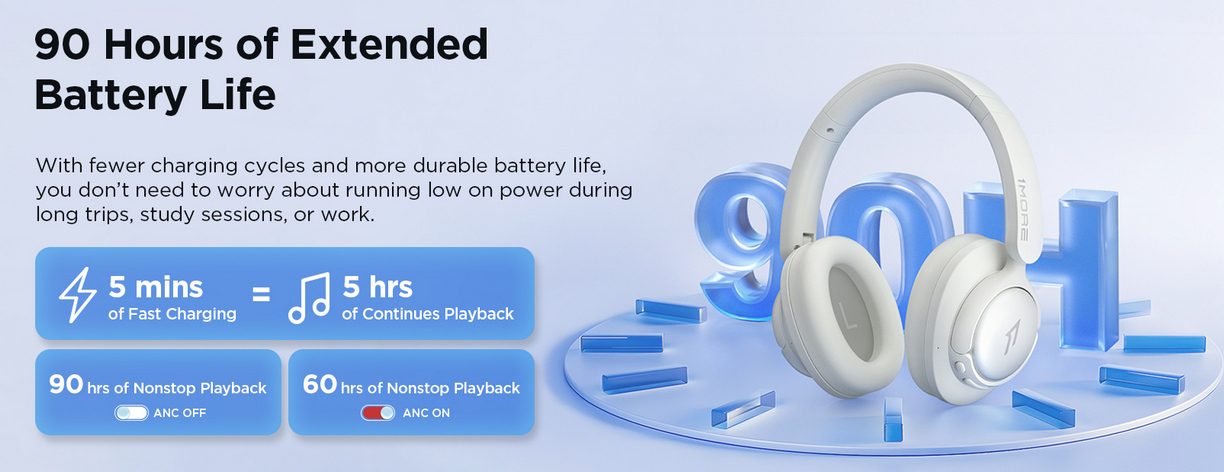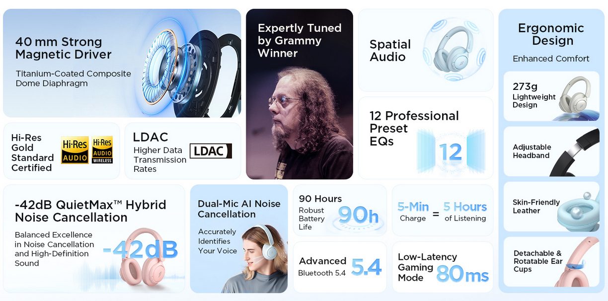 Bezdrôtové slúchadlá s potlačením hluku ANC a obrovskou výdržou až 60 h s ANC. Prenos Bluetooth 5.4 s HiRes kodekom LDAC, dynamické meniče 40 mm ladené držiteľom Grammy, 12 prednastavených režimov Ekvalizéra, kvalitné mikrofóny s AI potlačením šumu, funkcia priestorového zvuku.