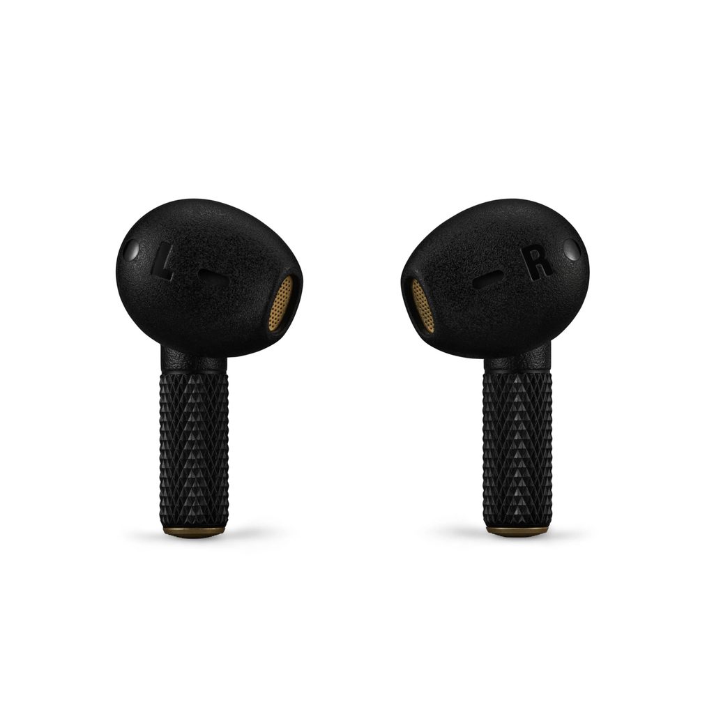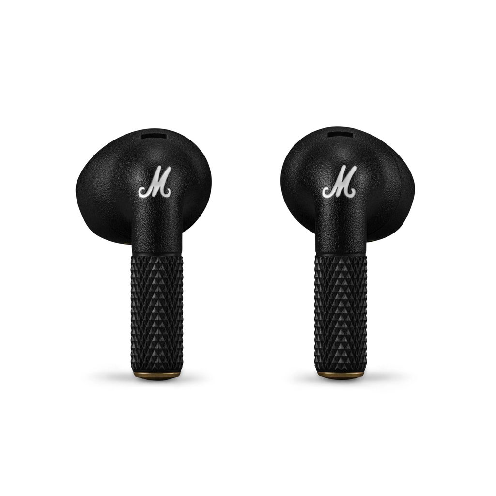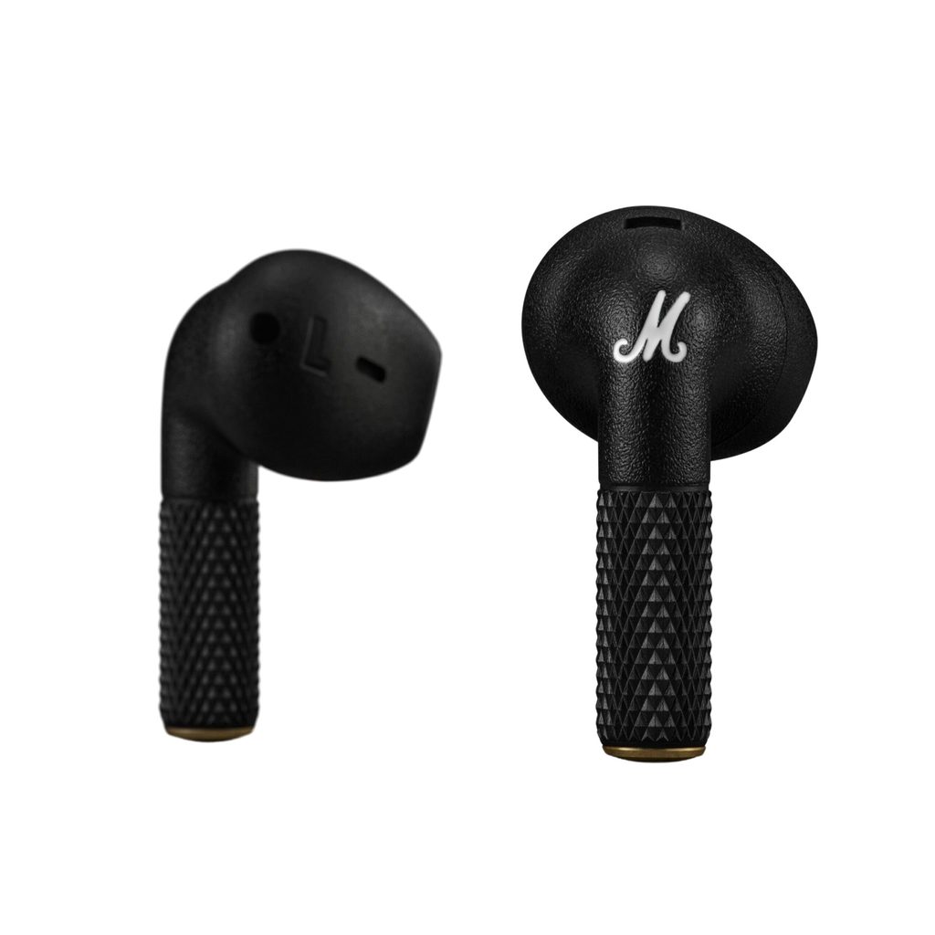 Impozantná je minimálna hmotnosť slúchadiel. Malé čierne dobíjacie púzdro s koženým vzhľadom váži iba 41 g a slúchadlá samotné iba 4 g každé! Na oboch slúchadlách je vyryté magické „M“. Dĺžka slúchadiel je opatrená neklzkým povrchom pre bezpečnejší úchop. Nabíjacie piny, ochranná mriežka meničov a samotné slúchadlo sú opatrené ružovo zlatým povrchom, čo slúchadlám dodáva lesk a eleganciu. Pre Marshall je dôležitá udržateľnosť, preto využívajú 90 % recyklovaných plastov z použitých predmetov, ako sú CD, práčky a elektrobicykle.