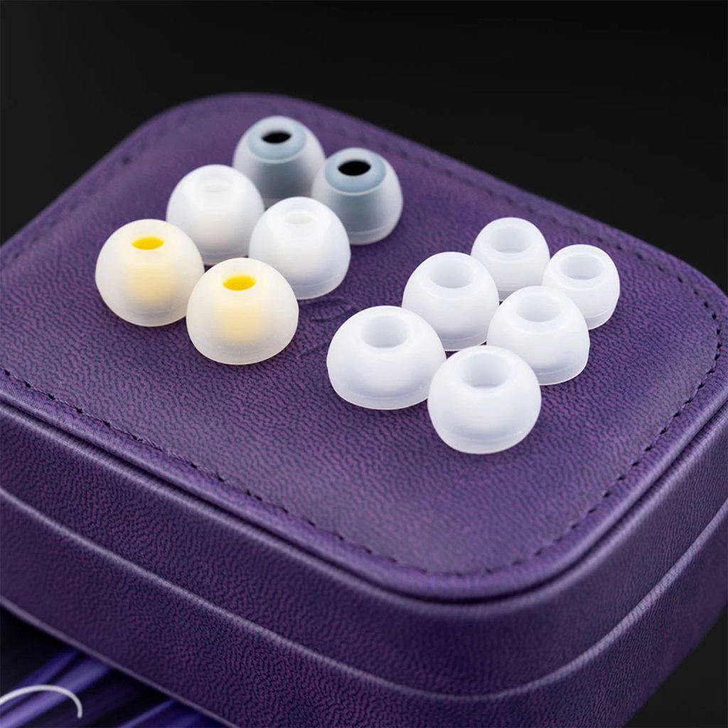 V balení sú ďalej k dispozícii dve sady silikónových nástavcov. Každá sada obsahuje tri veľkosti náušníkov (S/M/L). Jedna sada je zameraná na vokály – prináša vokály bližšie k uchu a zvýrazňuje výšky, druhá poskytuje vyvážený zvuk s hladkým prepojením všetkých troch frekvenčných pásiem.