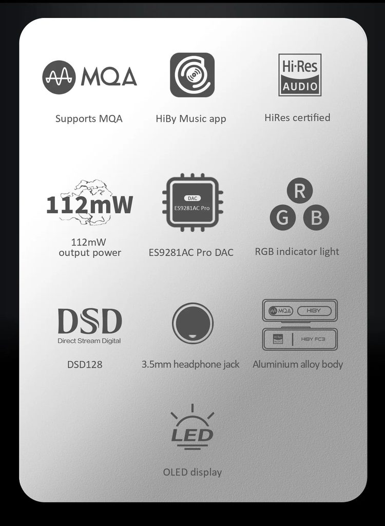 Miniaturní D/A převodník a sluchátkový zesilovač se vstupem USB-C a výstupem Jack 3.5 mm pro sluchátka. Podpora MQA i DSD128 formátu, D/A převodník ES9281PRO, OLED displej, RGB LED indikace, kovové tělo. Výstupní výkon až 112 mW.
