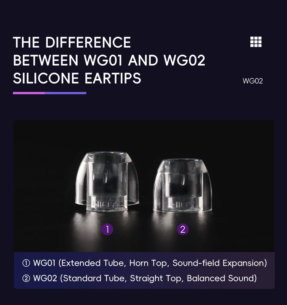 Silikonové nástavce HiBy WG02 jsou dostupné v sadách různých velikostí, aby se zajistilo perfektní utěsnění pro většinu uživatelů. Nástavce jsou nabízeny ve variantách SSS, MMM a LLL (malé, střední a velké v různých sadách) pro optimální usazení. K dispozici je také mixované balení SML pro ty, kteří si chtějí otestovat, která velikost jim nejvíce vyhovuje.