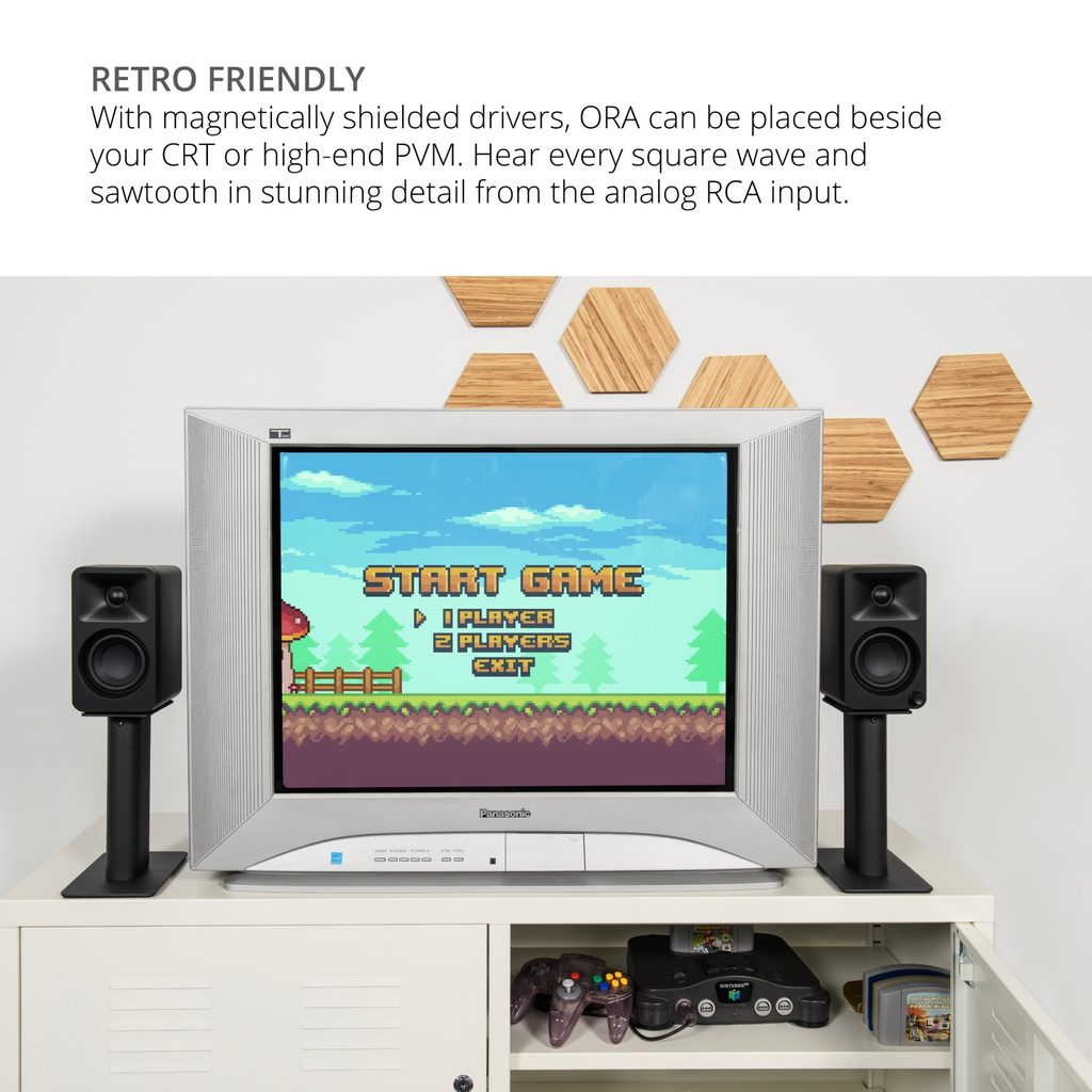 Výkonné dvoupásmové stolní monitory pro kreativní práci, poslech hudby i hraní her. Výkon 50 W, vstupy RCA / Bluetooth 5.0 / USB-C, výstup pro subwoofer. Basový měnič o průměru 3 palce, výškový tweeter z hedvábí, zvuk kontrolovaný kvalitním DSP. Samostatné zesilovače třídy D pro každý měnič.