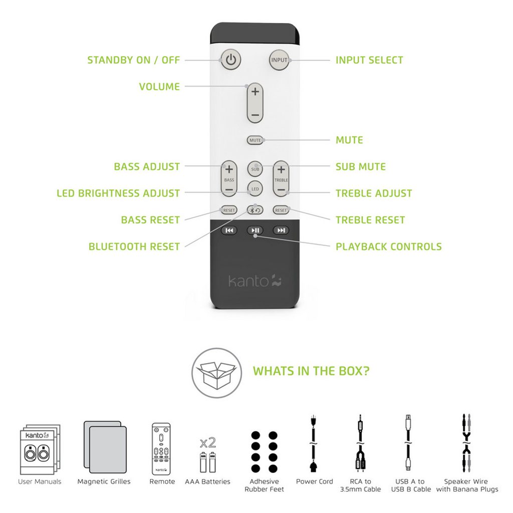 Nejvyšší model aktivních reproduktorů KANTO. Špičkový páskový reproduktor pro pásmo výšek, výkonný basový měnič 5.25″, přenos Bluetooth 4.2 s kodekem aptX. Celkový výkon 130 W, vstupy Phono / Optický / USB DAC / Cinch. Výstup pro sluchátka i subwoofer. Možnost nabíjení dalších zařízení přes USB.