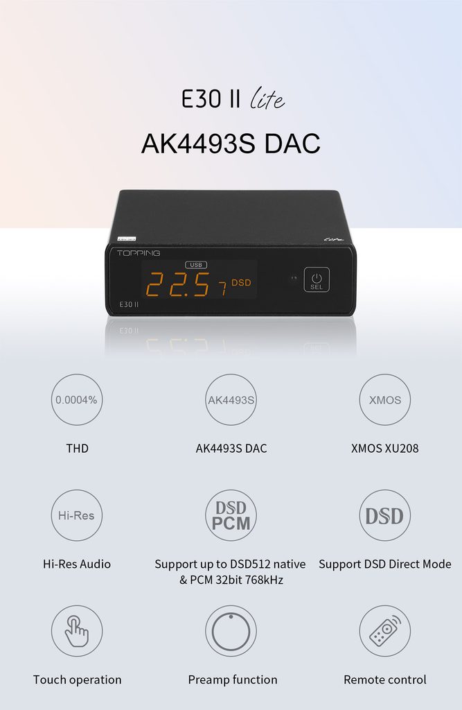 Zjednodušená verze stolního D/A převodníku s čipem AK4493S a ovladačem XMOS XU208. Podporované rozlišení PCM 768 kHz / 32 bit a DSD 512. Vstupy: USB, optika, coax. Dálkové ovládání v balení. Napájení samostatným USB. Vestavěný předzesilovač s nastavením hlasitosti.